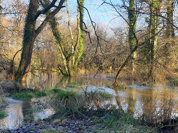 On the 16 January 2023 I had a meeting scheduled for 08.30 at Kingsbridge to meet contractors, requiring access to cut back trees under the pylon lines that cross the Lees Estate. It normally takes me about 25 minutes to get from my home in Wimborne to Kingsbridge, but it took me an hour and a quarter. The rainfall during the night, on top of heavy rain in the previous week had caused streams in ditches to become torrents and the rivers were leaping out of their banks and dancing where the contours took them.